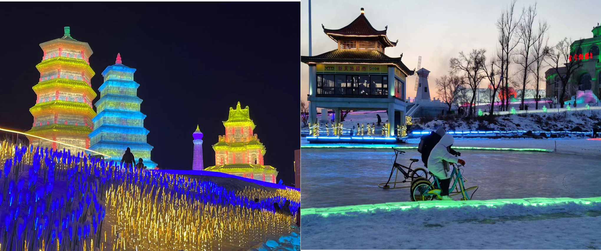 第一站,长春冰雪新天地。长春冰雪新天地以“都市冰雪·相约长春”为主题,围绕“冰雪旅游”“冰雪文化”“冰雪体育”“冰雪研学”“冰雪商贸”5个板块,运用“数字科技+国潮IP+时尚元素”及夜游灯光设计营造现场氛围,将科技、文化与艺术融入冰雪项目,体验各种冰雪运动,打陀螺,滚雪球,滑冰梯等,将吃,喝,娱,游融为一体,大力带动东北经济的发展。