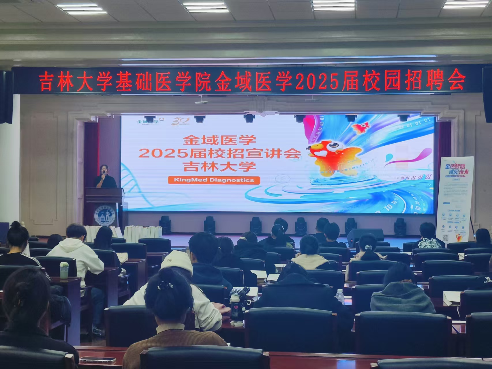 校友、吉林金域市场部血液肿瘤条线产品经理、科研负责人郇有为学长给同学们分享了他在金域医学集团的成长故事。他从自身角度出发为同学们讲述了选择金域公司的原因以及在金域的发展;郇先生的亲身经历和心路历程,让在场的同学们感受到了金域医学集团良好的工作氛围和发展平台。最后工作人员详细介绍了金域医学2025年校园招聘的岗位需求、应聘方式以及招聘流程,并提醒同学们注意查收面试信息。