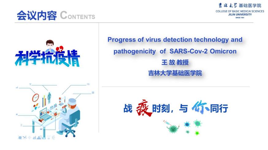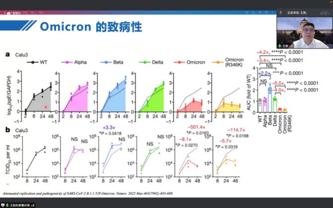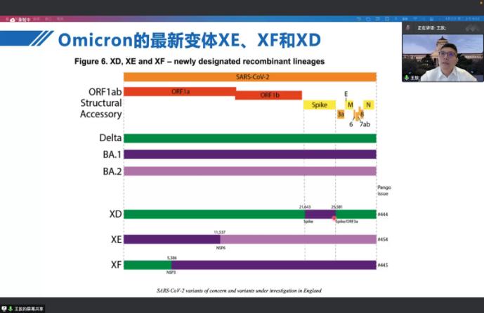 院长王放教授做了题为“Progress of virus detection technology and pathogenicity of SARS-Cov-2 Omicron”的专题讲座。王放教授首先以新冠病毒为例,详细阐述了目前全球范围内开展的病原体检测方法,并介绍了新型前沿的病原体检测技术。王放教授又分享了近期发表于CNS期刊上的新冠病毒最新科研动态,强调新型冠状病毒奥密克戎是新冠病毒的变异株,通过对比新冠病毒不同亚型的病原学特征及致病性,总结了疫情之下我们该如何进行有效的防护以及科学的治疗方式。与会师生们针对最前沿的新冠病毒检测技术、新冠病毒感染治愈后是否会形成机体免疫等方面展开积极互动交流。