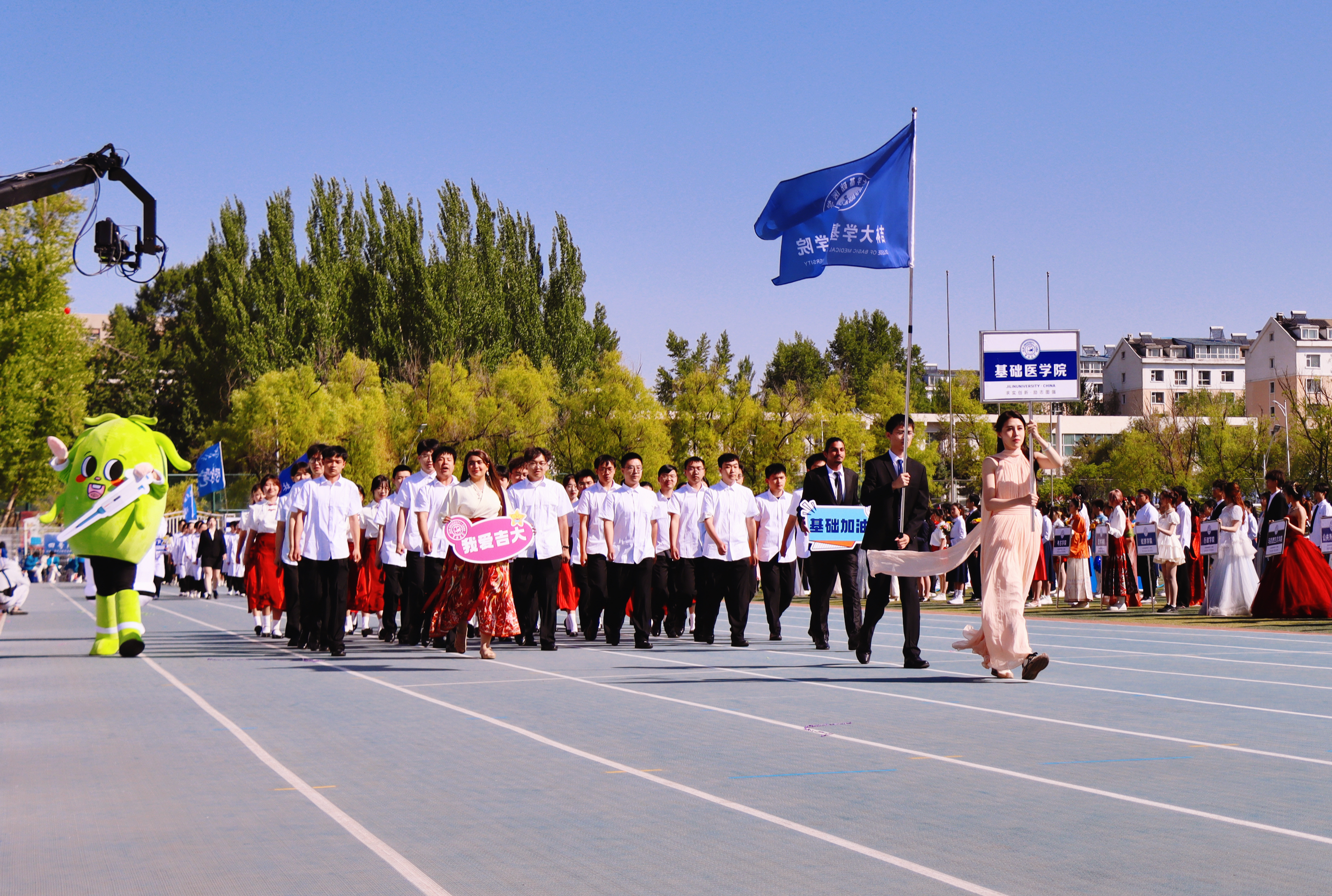 本科生、研究生和留学生组成,首次亮相的吉祥物“小医”和“小智”,由学院老师和学生共同设计,展现了师生们丰富的想象力和对未来医学发展的期望与畅想。作为以生物医学科学专业白求恩班拔尖人才培养为引领,融合MBBS留学生的中国医学人工智能领航团队,他们承载着基础医学雄厚的学科底蕴,凝聚交叉融合创新之力,在“新医科”浪潮中破浪前行,在服务国家战略需求和人民生命健康的道路上,不断攀登新的高峰。本届运动会学院首次实现本科生、研究生、留学生与教职工们共同参赛,不同学历、不同国籍的学生们在运动会中互相学习、相互鼓励,共享体育竞技的乐趣,共同追求卓越的体育精神,加深了师生之间的交流与理解,构建积极向上的校园氛围。