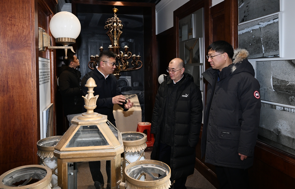 在新民校区基础楼,朱国贤一行实地察看楼宇修缮和保护情况,对日本性爱