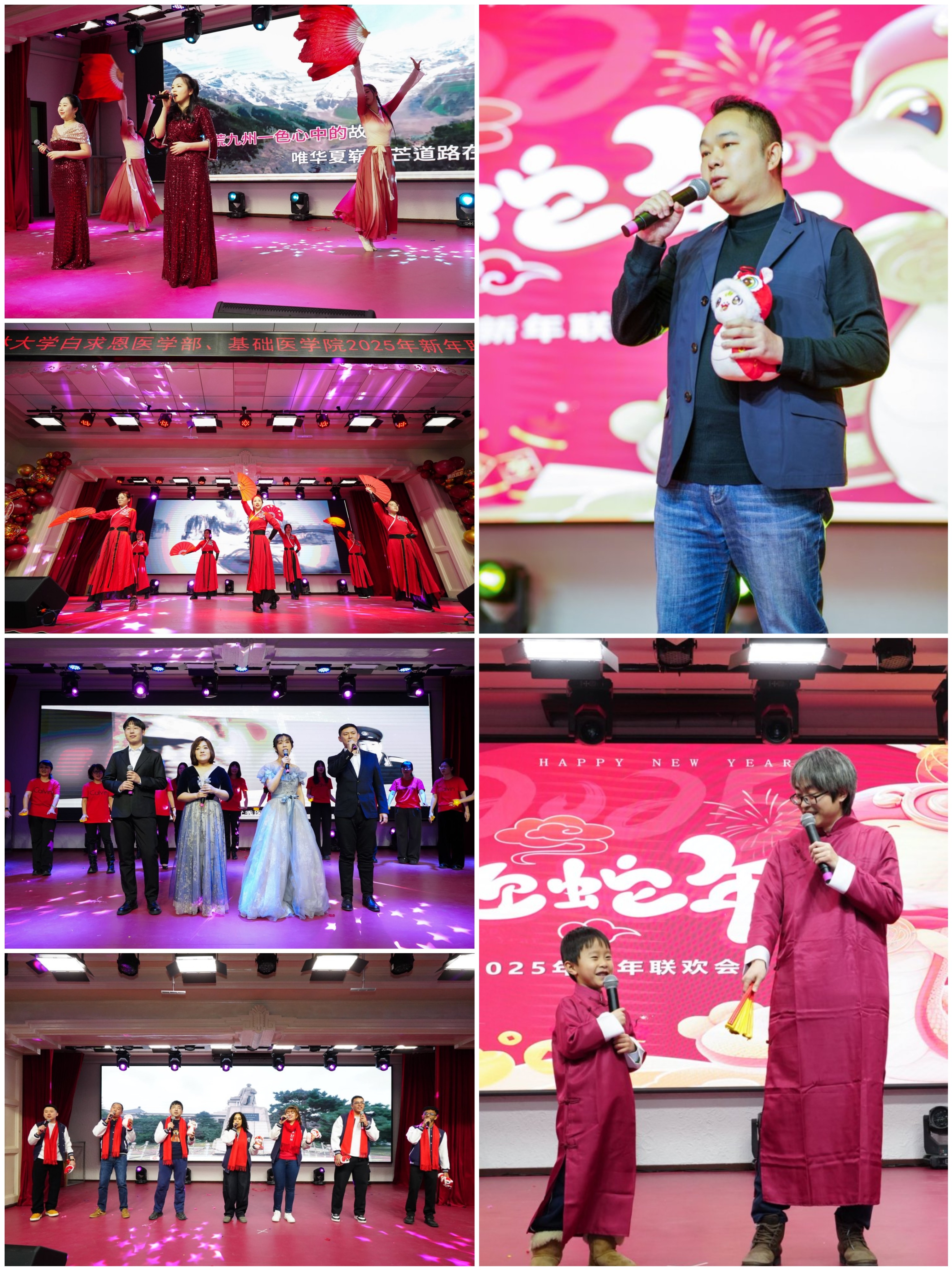联欢会在长春市第一实验银河小学星星合唱班孩子们演唱的一曲《爱漫天空》中拉开序幕,优美的童声仿佛带我们进入了梦幻的世界;教职工第一党支部带来的扇子舞《雪龙吟》,将中华古典舞蹈完美的呈现,让我们领略了老师们的风采与活力;白求恩医学部王曦老师带来的独唱《木鱼与金鱼》,让现场观众深深沉浸在歌曲的旋律与情感之中;王放院长与智加未来、华为两位企业嘉宾合唱歌曲《跟往事干杯》,用歌声对过去致敬,同未来举杯,将现场气氛推向了新的高潮;组织学与胚胎学系带来的小合唱《财神快点来》,免疫学系、细胞遗传学系以及实验教学中心三综合带来的小合唱《一路生花》让我们感受到了浓浓的喜庆与祝福;丁健峰老师和他可爱的儿子表演的相声《说好不说好》让现场欢声笑语不断;来自吉林省艺术学院的实力唱将刘华晨老师演唱的歌曲《日落大道》和《男孩》,惊艳全场;病理学系带来的歌伴舞《苹果香》、生理学系的歌伴舞《万疆》,生物化学学系,实验教学中心二综合及测试中心合唱的《少年的你啊》,纷纷展现了学院教职工蓬勃向上的精神面貌,赢得了阵阵喝彩;学院留学生班主任及四位留学生同学带来的歌曲《恭喜发财》,将不同文化的魅力融合在音符间;白求恩医学部张博老师带来的魔术《654俱乐部》精彩纷呈,让人眼前一亮;最后由日本性爱