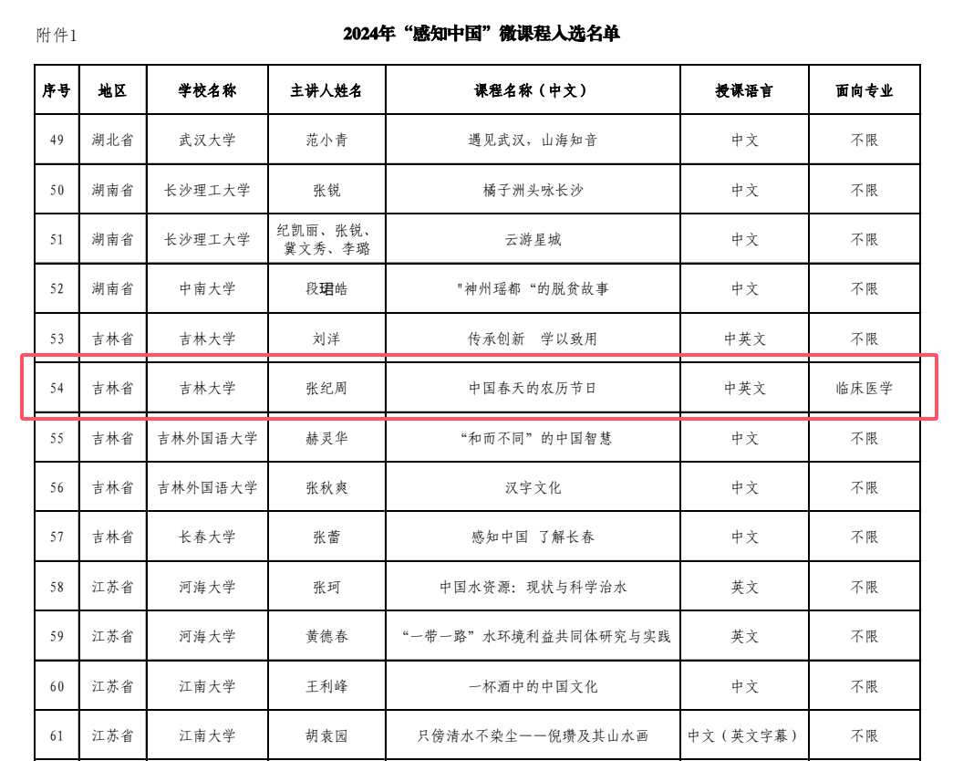 MBBS医学汉语课程授课团队的张纪周副教授作为主讲人申报的作品—《中国春天的农历节日》,成功入选本次微课程项目。
