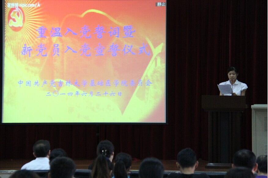 最后,孙赵华代表院党委对新党员加入到党的组织表示祝贺,并希望大家铭记宣誓的神圣时刻,践行入党誓言。同时,他代表学院党委向所有党员提出五点希望:一是要正确认识学院当前面临的机遇和挑战,进一步增强党员意识、宗旨意识,进一步增强每名党员的责任感和使命感,继承和发扬党的优良传统,永葆先进性。二是要全面贯彻党的教育方针,扎实推进学习型党组织建设,以共产党员的标准严格要求自己,为办好人民满意的教育发挥我们每名共产党员的先锋模范作用。三是要立足本职,在教学科研工作中创先争优、在创建和谐学院中创先争优、在服务师生中创先争优,努力在各项工作中团结带领群众争当先进。四是要以改革创新精神加强自身建设、加强党风廉政建设,不断开创党的基层组织建设新局面,为学院各项工作的开展提供坚强的组织保证。五是要不断发扬求实创新、励志图强的吉大精神,展示新形象,创造新业绩,为学校、学院的改革与发展多做贡献!