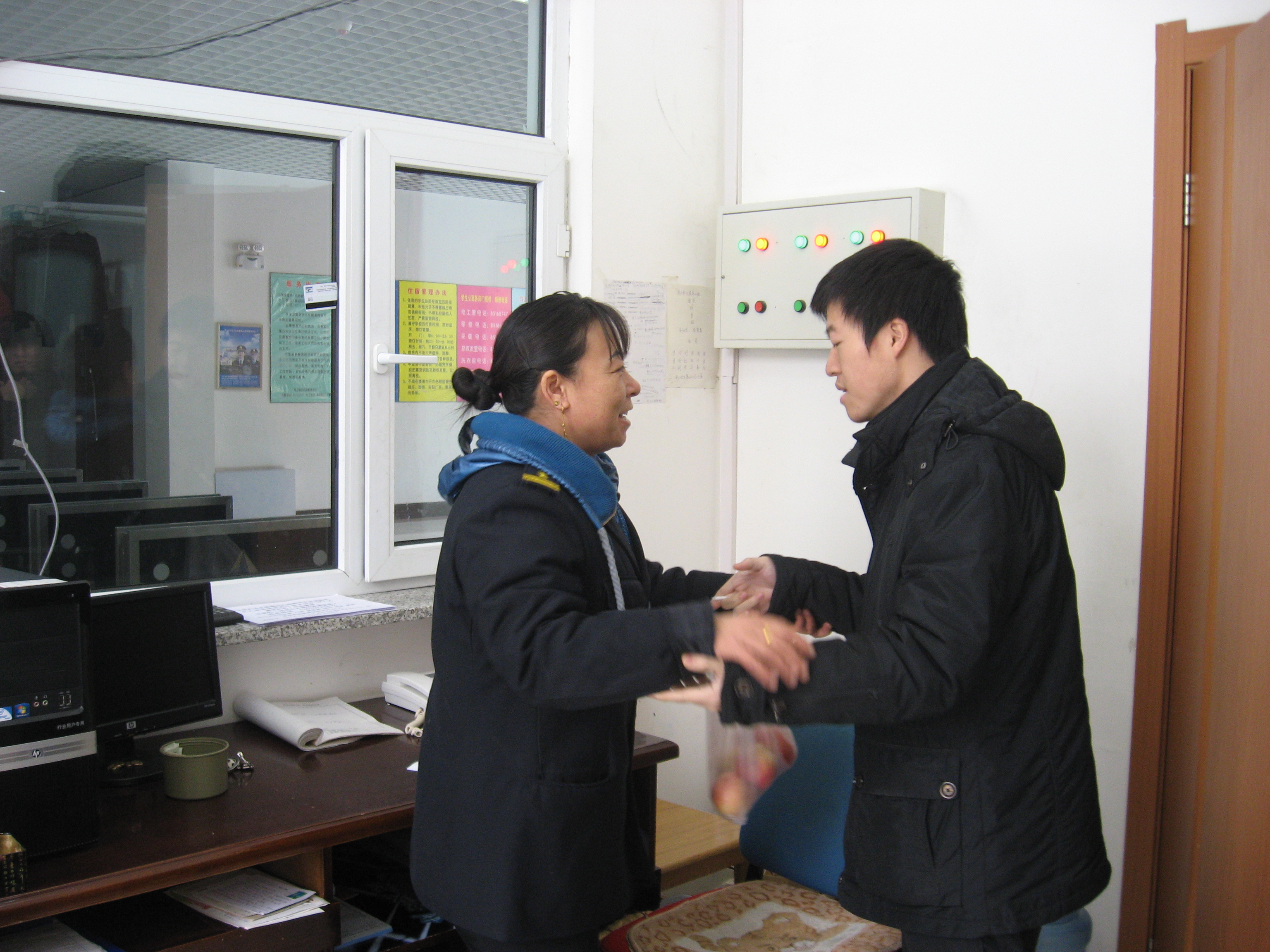 为感谢宿舍管理人员长期对同学们无微不至的照顾,志愿者们自发组织各个寝室收集废纸,瓶子等废品,然后用卖废品的钱为宿舍校工卖水果来表达同学们的感激之情。同时大家也为如亲人一般关爱我们的宿舍校工送去一份冬季养生小常识,希望能在寒冷的冬天给大爷大妈送去一份别样的温暖。宿管人员面对志愿者们的突然来访慰问显得异常开心激动,同时志愿者们也想宿管表达了自己的感激之情。让宿管人员感到温暖的同时,同学们对于感恩也有了新的理解,此次志愿服务得到了宿管的极大称赞。