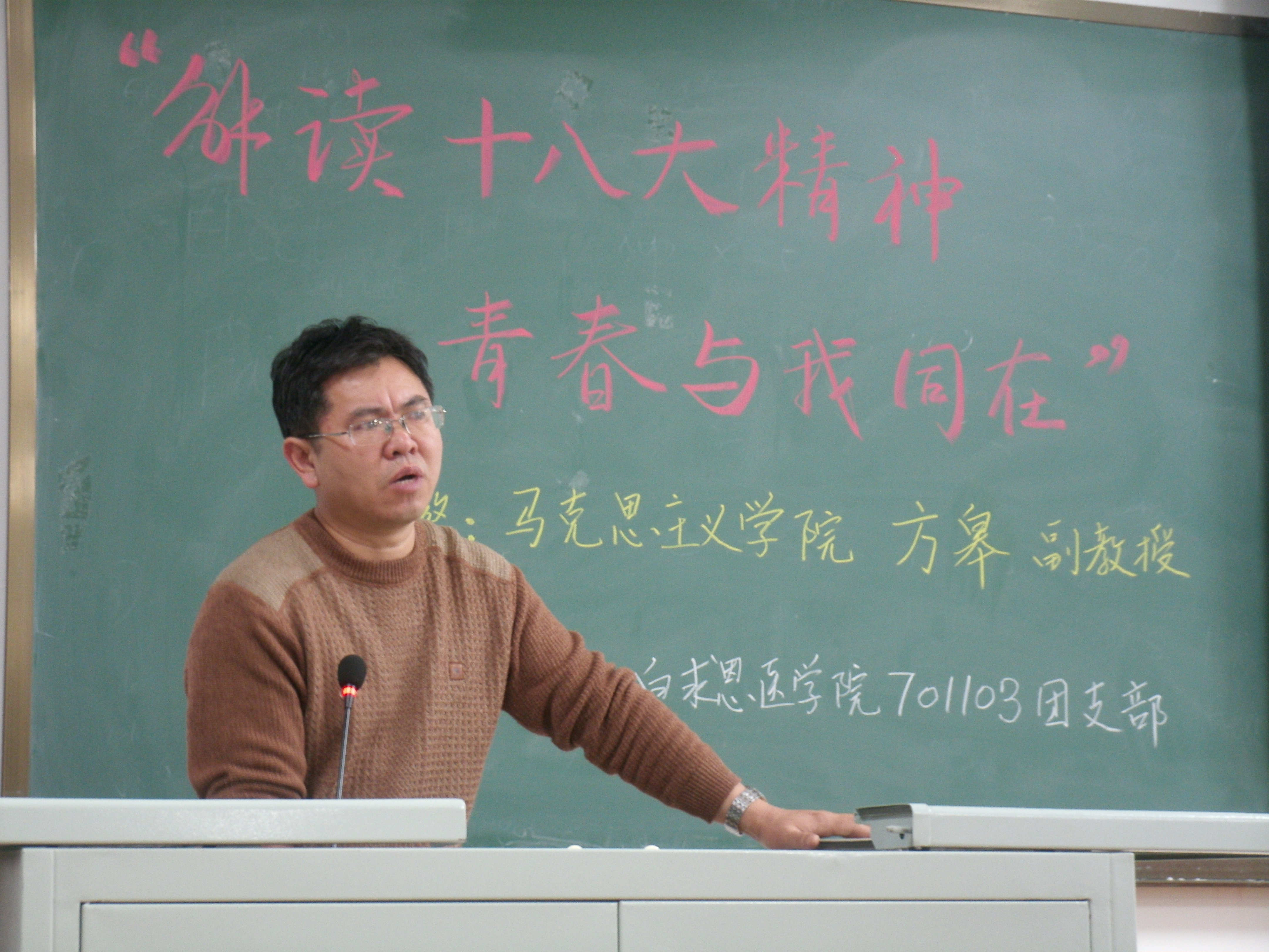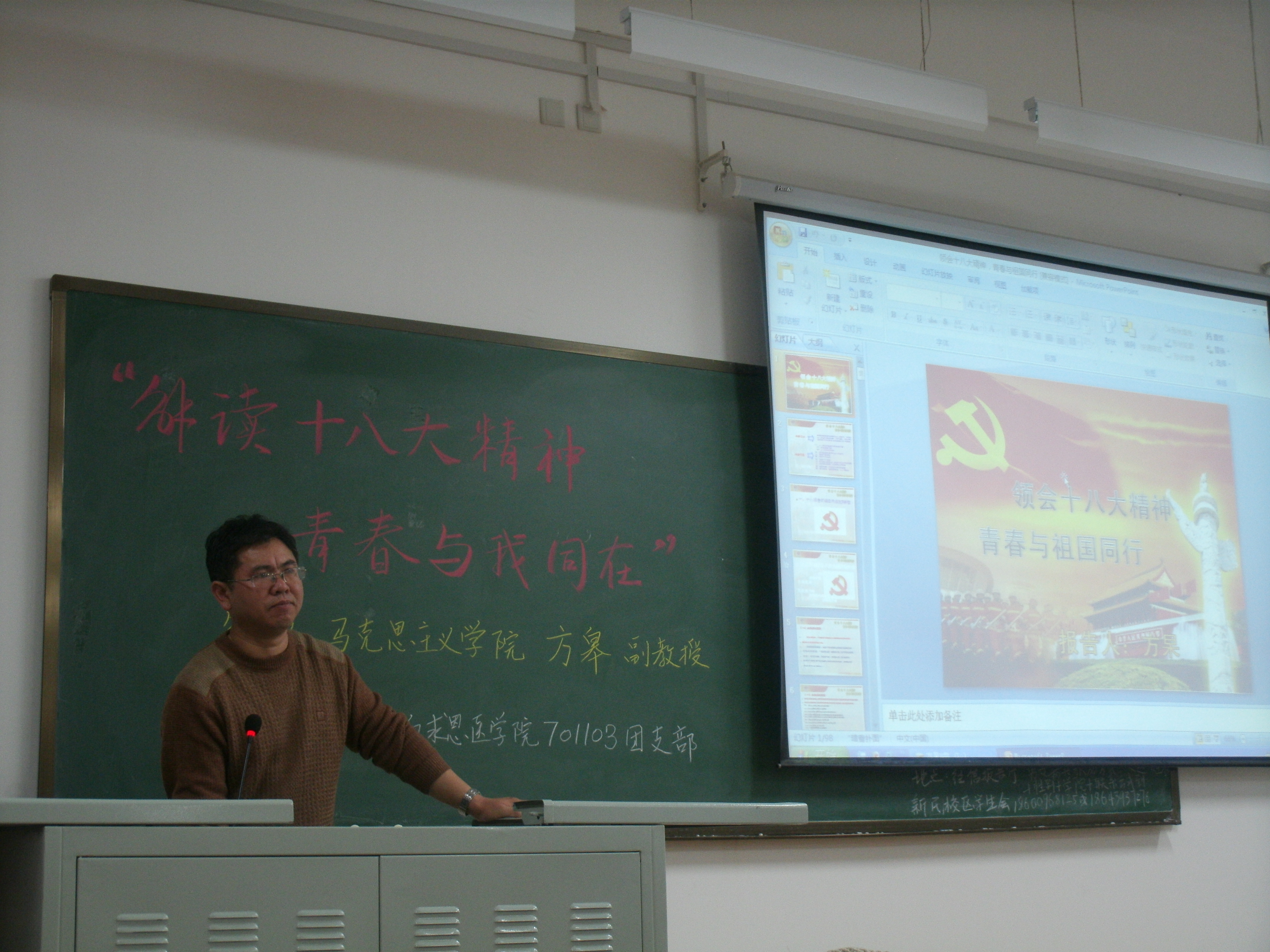 为响应学校、学院关于深入学习十八大精神的号召,11月29日下午3点半,701103团支部邀请马克思主义学院硕士生导师方皋副教授,在中心校区李四光教学楼309教室举行“解读十八大精神,青春与祖国同行”主题班会。