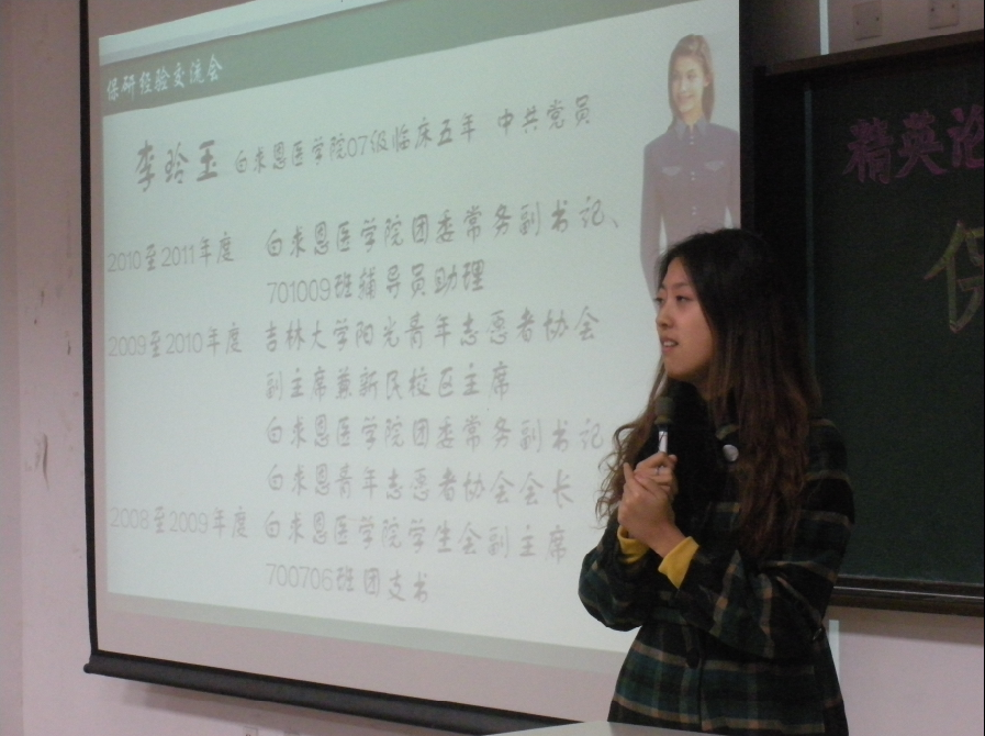 10月26日晚,由白求恩医学院学生会主办的“读书活动月”系列活动——精英论坛之研究生推免经验交流会在新民校区第二教学楼2101教室举行。白求恩医学院副院长程丕显、教务办公室副科级秘书姜威以及2007级保送到北京协和医院的石宁、保送到北京大学的郭倩、保送到复旦大学的高稳、保送到日本性爱