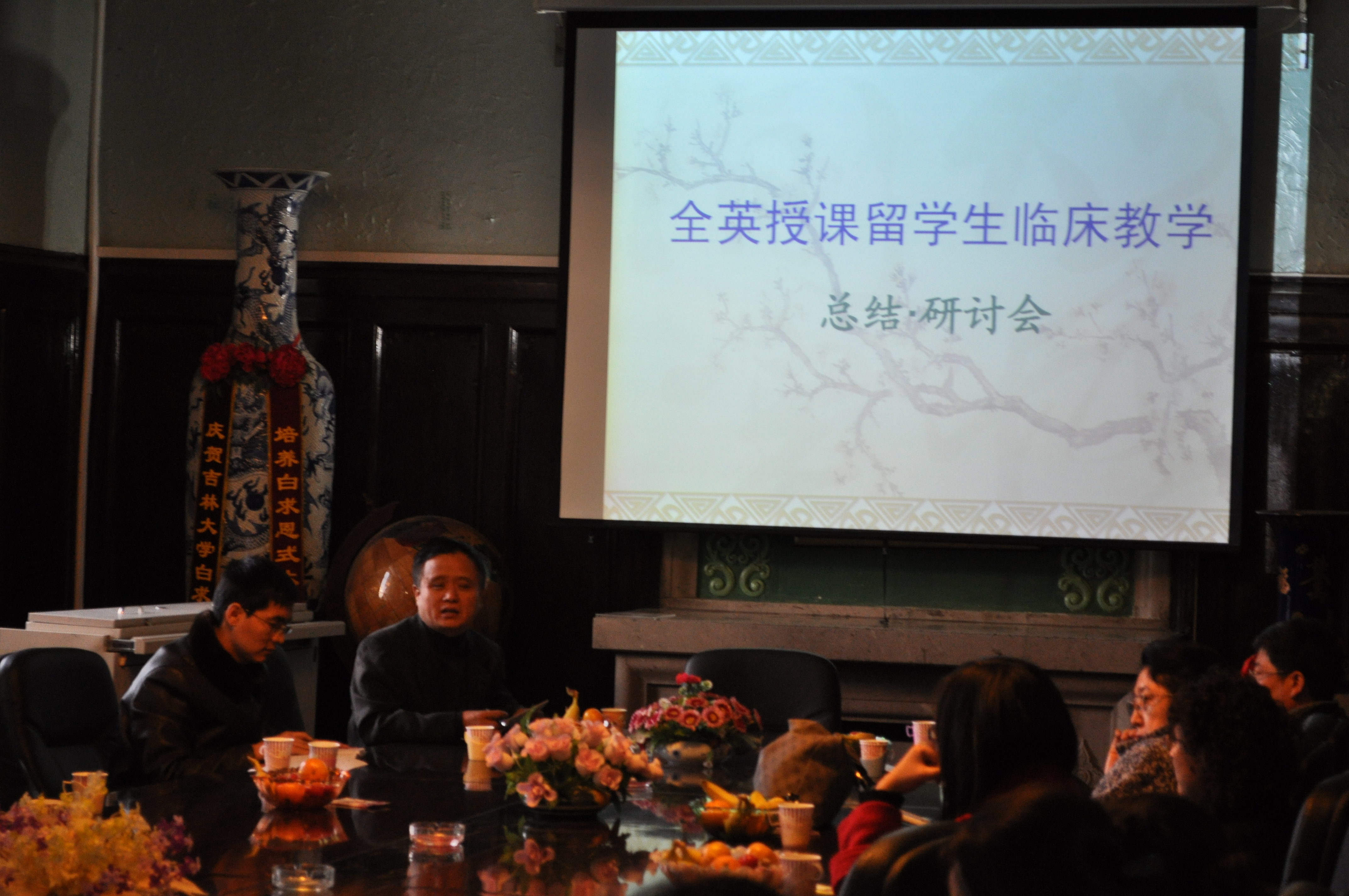 各学院在读学历生的36%,共有23个全英授课教学组承担26门临床课程的教学任务。在各位教师的努力以及各院科教部的支持下,全英授课教学取得了较好成绩,得到了留学生的认可。但在教学过程中,我们在办学理念、教材建设、教学方法、临床实习及师资培训方面存在些问题,希望大家与学院一起集思广议,为完善体制、机制、改良教学方法、加强教学改革与管理等建言献策。白求恩医学院院长助理兼留学生办公室主任颜世军就本学期三个年级26门课程的教学评价情况作了详细的说明和讲解。