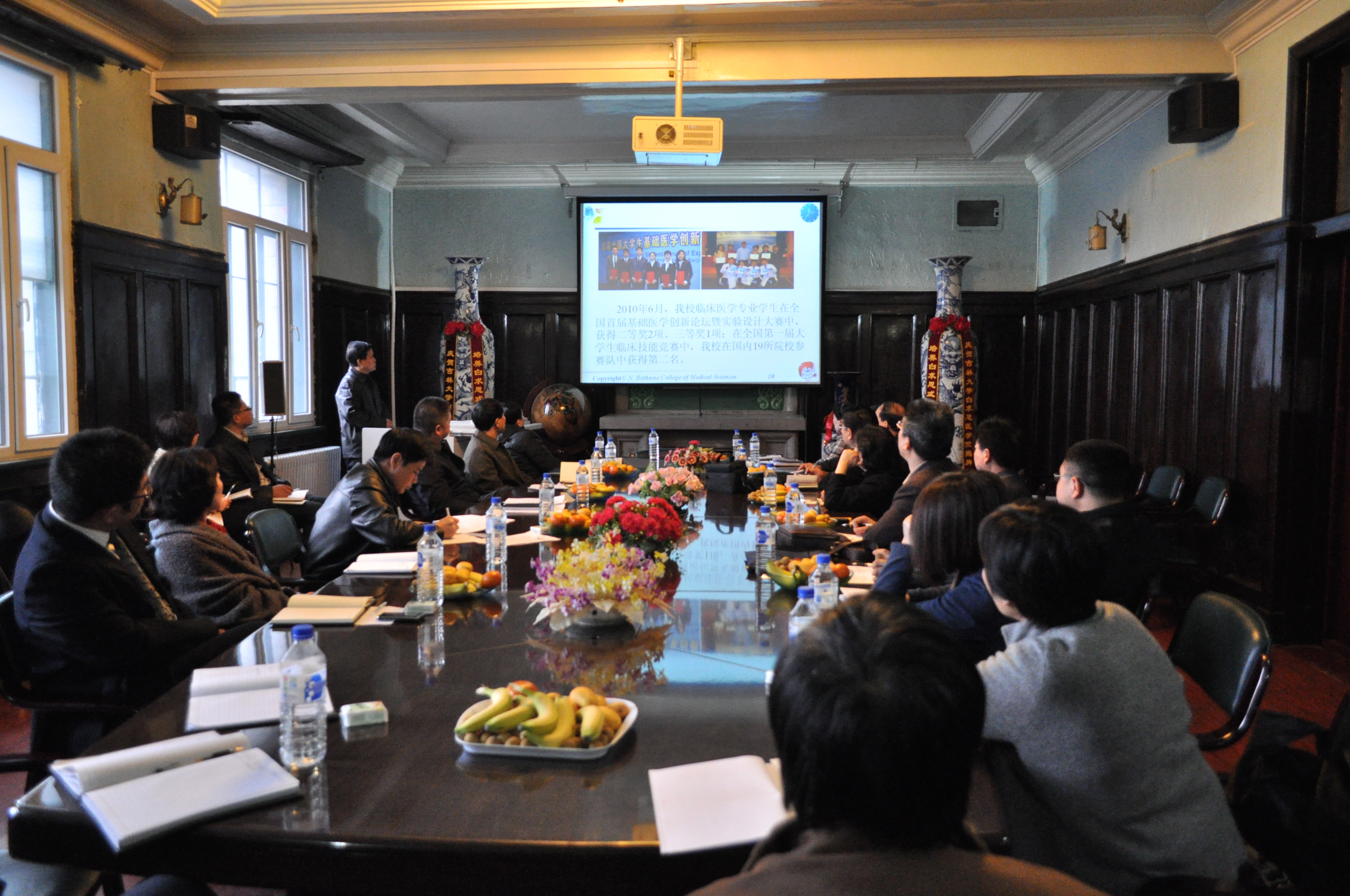及学院在教学、科研、师资队伍、人才培养、学科建设等工作中取得的成果做了简要概括。随后,白求恩医学院党委书记屈英和介绍了学院“十二五”发展规划(初稿)的形成和内容。白求恩医学院党委副书记兼副院长苑锐以“弘扬白求恩精神拓展医学生素质”为主线,详细介绍了学院在白求恩精神传承、校园文化建设、组织社会实践等方面的举措。白求恩医学院行政副院长韩丽华介绍了综合治理和后勤管理等方面的工作。
