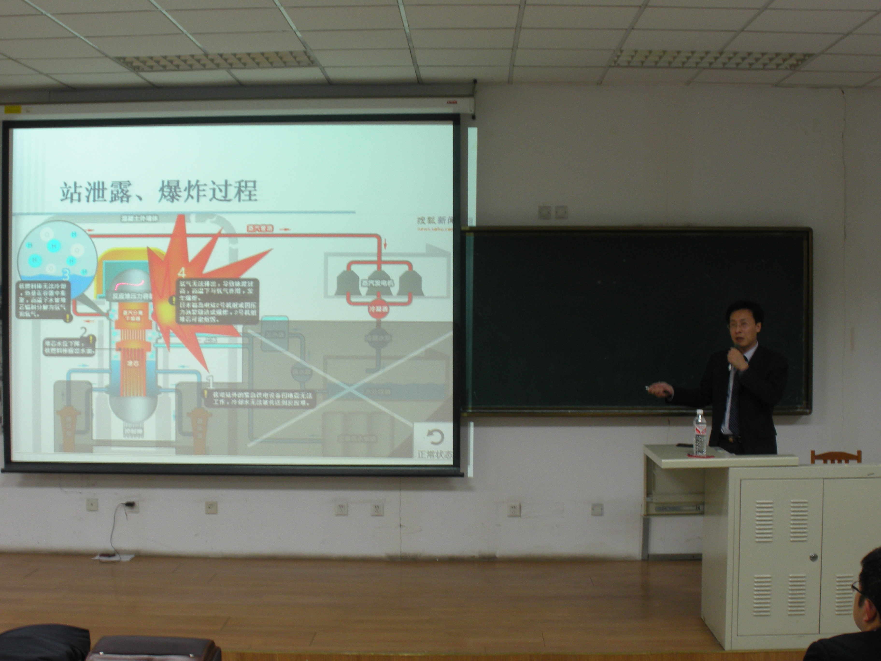 首先,刘晓东教授向大家通俗地讲述了核电站的原理,回顾了本次日本核泄漏事件的发展过程。随后就核扩散的影响因素、核污染的危害、核辐射不同剂量对生物体的影响、核辐射对人生理心理的影响等方面详细为大家做了介绍。同时,刘晓东教授告诉同学们,要理智对待“核”,不要盲目跟风。最后,刘晓东教授总结了日本此次核泄漏事件的经验教训,与同学们共同探讨了应对核辐射的紧急措施。