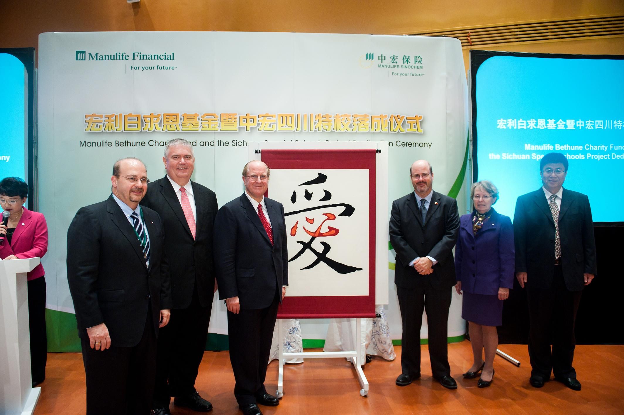 副校长王冠军、白求恩医学院党委书记屈英和等出席了仪式。仪式上,副校长王冠军与加拿大大使馆公使南杰瑞、宏利金融董事长Ms.Gail Cook-bennett、宏利金融总裁兼首席执行官邓广能等进行了亲切的交流,并共同书写中国字“爱”,标志着“宏利白求恩基金”的成立。