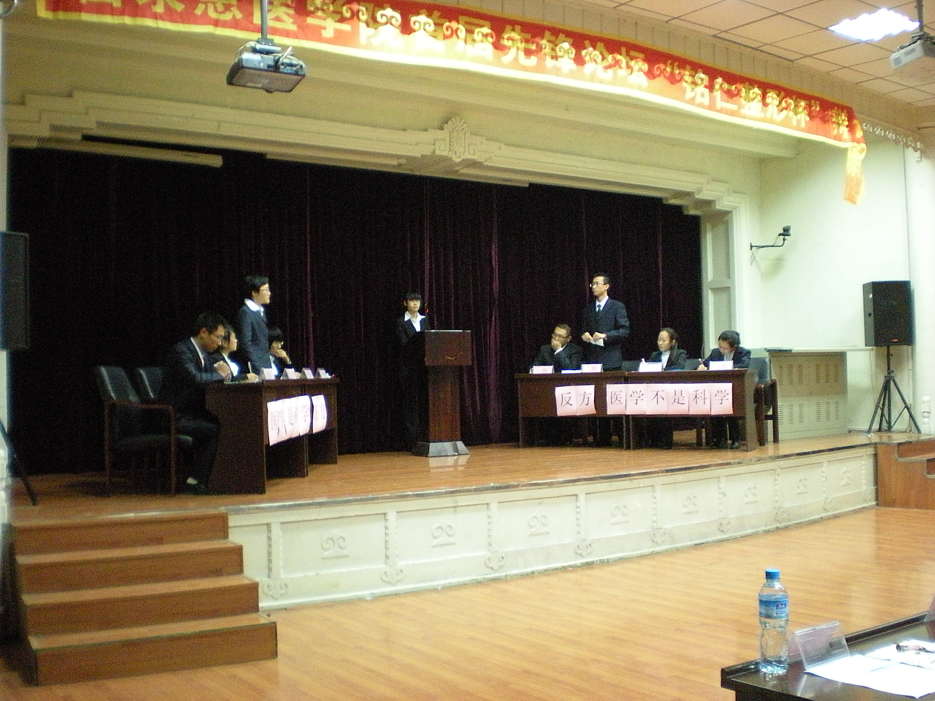 10月18日晚,白求恩医学院首届先锋论坛“铭仁整形杯”辩论赛在基础楼二楼多功能学术报告厅落下帷幕。2010级长学制团总支对五年制团总支就“医学是否是科学”进行了一场友谊赛。学院党委副书记兼副院长苑锐、团委书记夏燕来、辅导员秦雪以及长春铭仁整形医院孙云鹏主任出席了辩论赛。