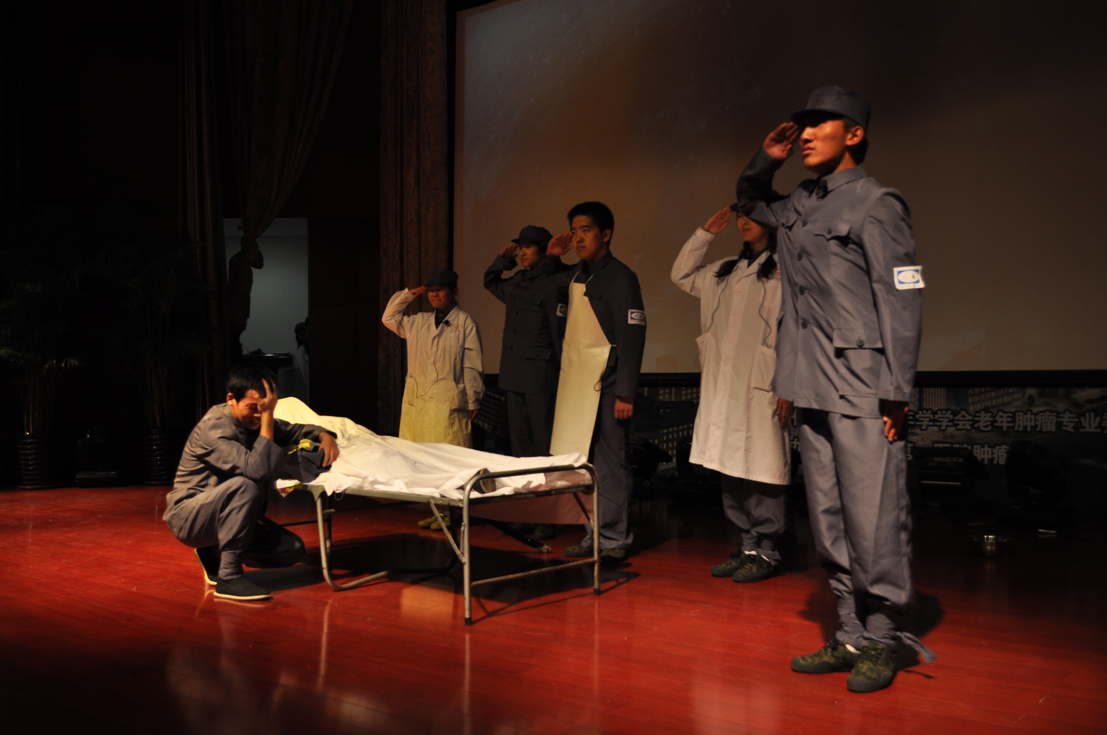 话剧表演结束后,李玉林教授鼓励大家要作一名优秀的白求恩式的医务工作者,做到政治坚定、医德高尚、医术精湛。最后,学院领导与演员们亲切合影。