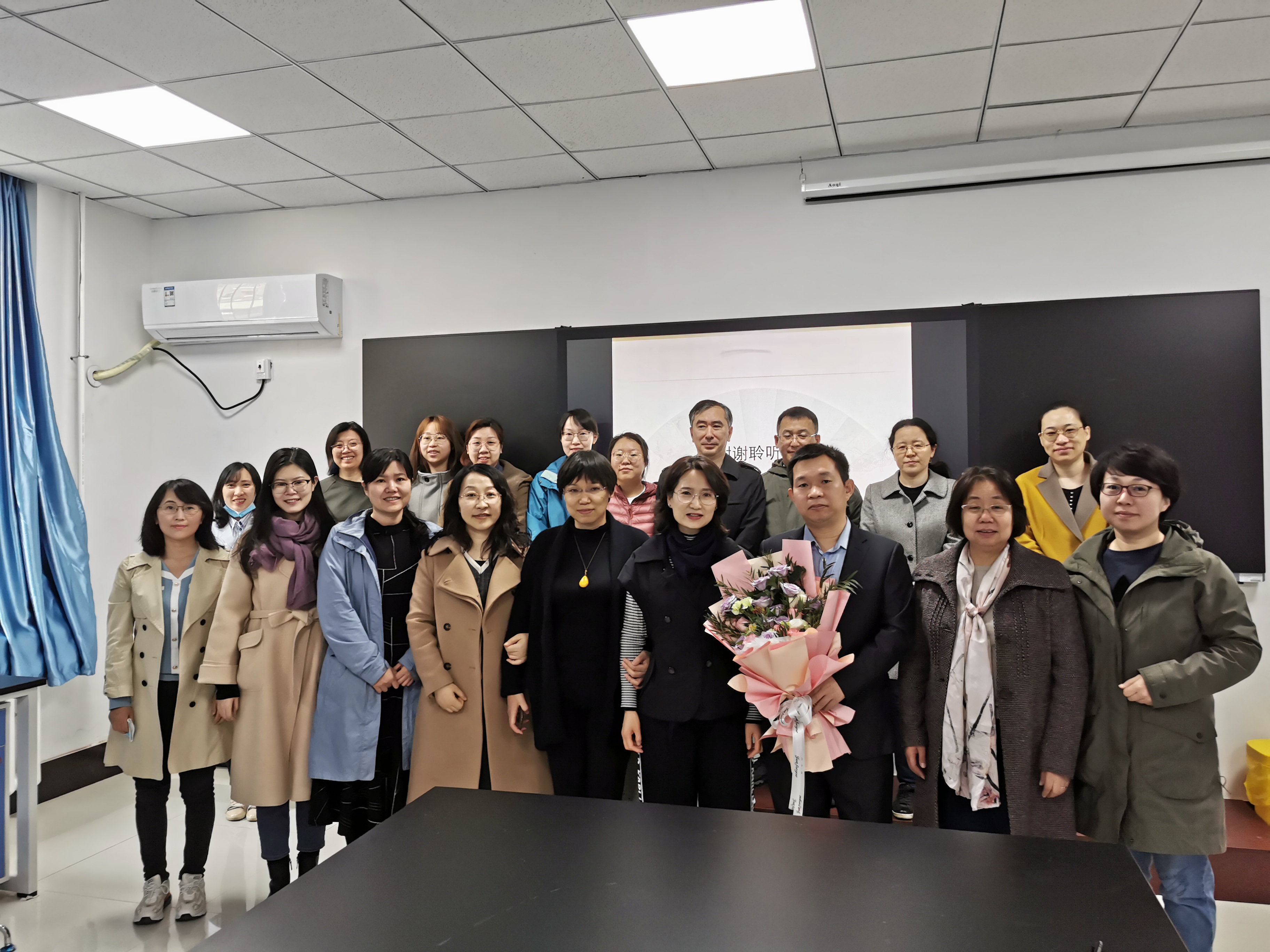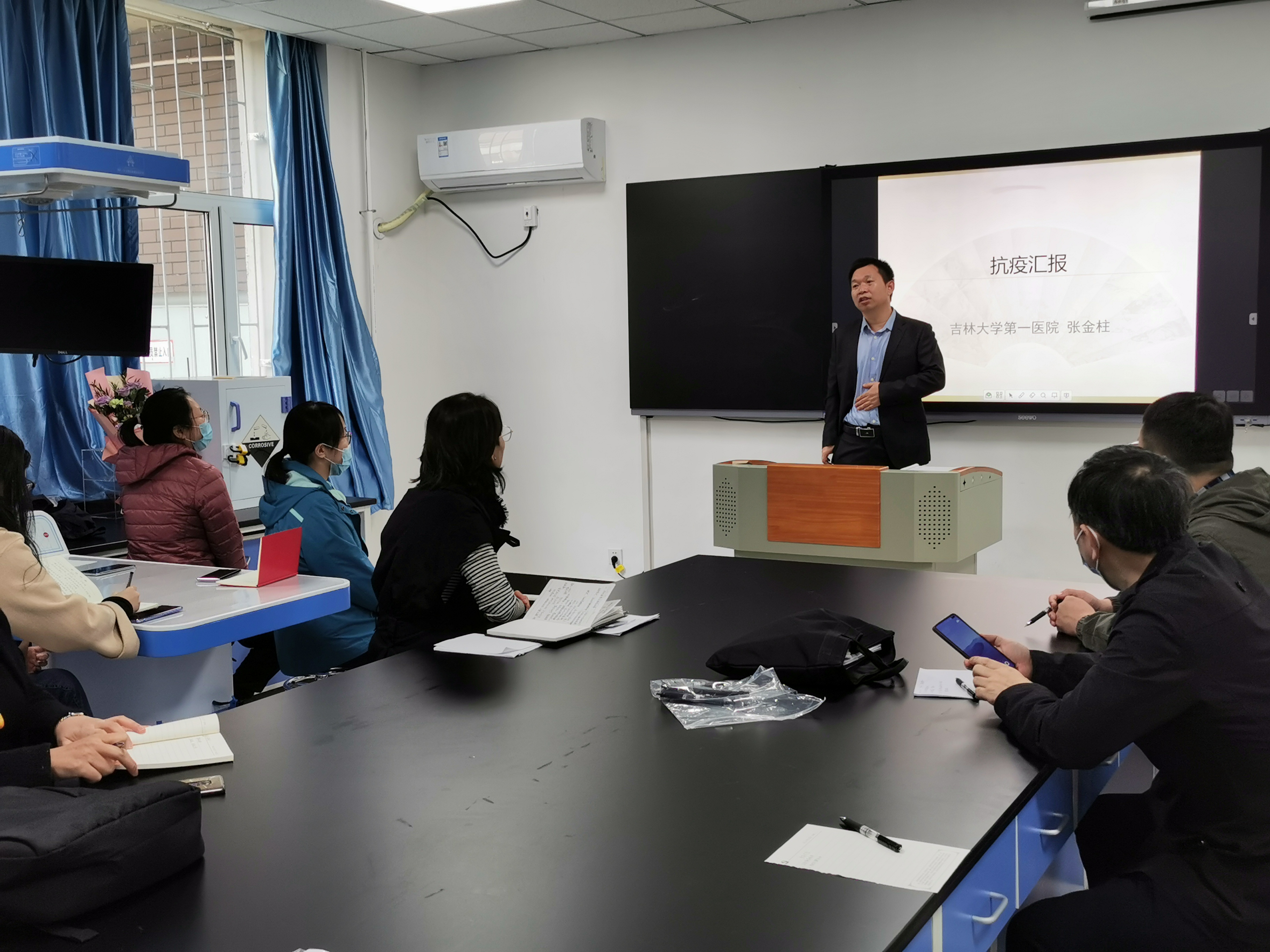 第一医院神经血管外科重症监护室张金柱老师讲座。张金柱老师在重症监护室工作10余年,对重症患者的救治非常有工作经验和独特见解,在2021年初主动请缨同吉大一院抗疫医疗队到通化抗疫第一线参加重症患者的救治工作。张老师从“政府不容易、人民不易和医务工作者不易”三个方面进行讲述,从学术专业角度讲述了新冠病毒的流行病学特点、临床表现、治疗及预防等,也说出了参加抗疫前后以及凯旋归来的所思、所想和所感,朴实的话语却感人至深,真正体现了一名普通的医务工作者“不畏艰苦、甘于奉献、救死扶伤、大爱无疆”精神面貌。随后,药理学系的靳英丽和关凤英两位老师与张老师进行了深入交流。