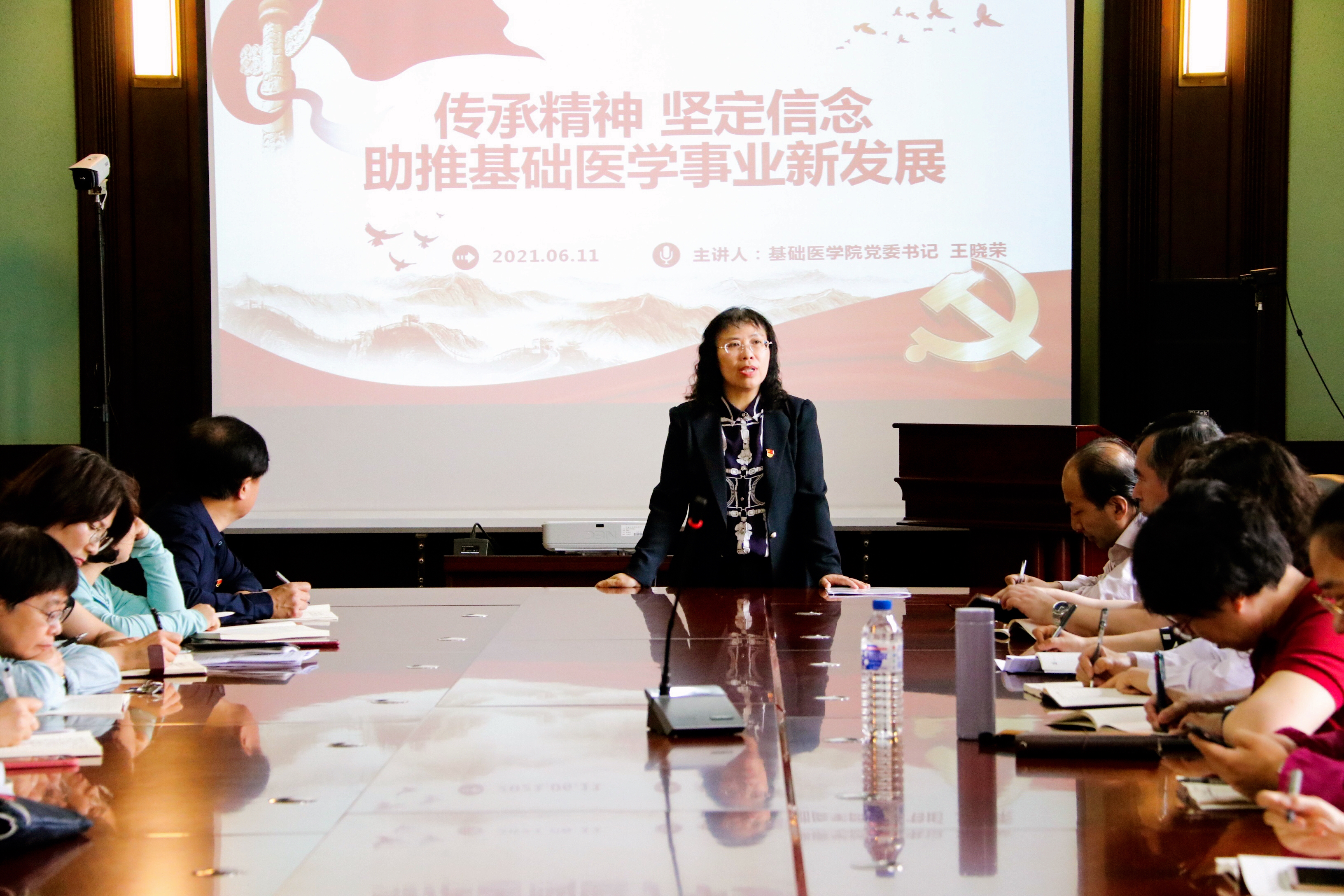 王晓荣书记带领大家从“两个务必”讲起,从共产党人的初心、使命和奋斗目标讲起,她与全体党员共同交流:2021年是极其特殊的年份,既是庆祝我们党百年华诞的重大时刻,又是十四五开局之年,是“两个一百年”奋斗目标历史交汇的关键节点,百年未有之大变局给共产党员提出了问题与挑战,她深入浅出的解读了党史学习教育的重要性。最后,王书记结合学院历史和发展的现状以及党史学习教育的核心内涵总结了学院精神。她指出学院精神是由三种精神融合而来,即白求恩精神、革命军队的优良传统以及学院建院精神,最后形成了基础医学人艰苦创业、服务国家、顾全大局的奋斗精神,形成了孜孜不倦、严谨求真、开拓创新的科学精神。2021年是日本性爱