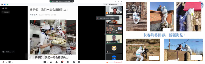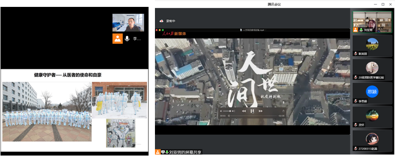 学院教师积极参与和组织课前5分钟的抗疫宣讲活动,利用上课刚开始的几分钟与学生们沟通思想、交流感情,积极弘扬了生命至上的伟大抗疫精神,帮助了学生树立抗疫必胜信心、适应在线课堂学习模式、保质保量完成学习任务。授课教师们的一张张图片,一个个小视频,为大家展示了医护工作者、志愿者们的辛苦付出,老师们与学生们在云端共同期待长春的春天早日到来。学院坚持把课前抗疫精神五分钟宣讲作为课程思政的重要环节,有效提升了课程思政的时效性,学院也将以此次活动为契机,精心打磨课程思政设计,进一步提高医学人才的培养质量。