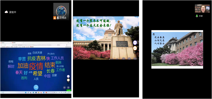 各个校区的抗疫剪影,为大家展示了吉大人用实际行动书写了吉大担当与吉大力量,鼓励同学要学会勇敢与乐观;9.法医学系授课教师为同学们播放了抗疫救治医疗队送首批治愈者回家的视频,通过视频中的蓝天、阳光和笑脸鼓励学生疫情终将被战胜;10.病原生物学系授课教师以当前的疫情形势作为切入点引入微生物学课程,并从专业的角度提醒学生注意防护,鼓励同学积极面对,提高医学生的使命感;11.遗传学系授课教师通过播放一组“夜幕下的长春”短视频,为同学们展示了镜头下安静的长春,但仍旧有抗疫工作人员的身影在忙碌,鼓励同学们不要浪费青春年华,与同学一起云端期待着早日见到长春往日的繁华景象;12. PBL教学组授课教师带领小组同学进行案例讨论,每位同学都分享了自己对抗疫的一些心得与体会,字里行间是同学对吉大 “饲养”的感谢,对教师辛勤工作的感谢,也是对抗疫工作者辛苦付出的感谢;13.病理生理学系授课教师在线为学生播放《人世间—抗议特别版》,并总结道:我们的岁月静好,正是因为这些投身抗疫工作的人们的负重前行,鼓励学生不要浪费学习的机会,要坚信“疫去春来”。