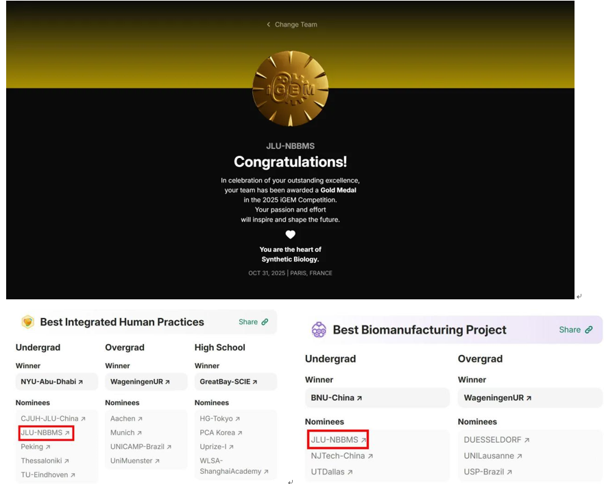 在本届大赛中,JLU-NBBMS团队在生物合成赛道(共47支队伍)和综合人类实践项目(共413支队伍)中分别跻身全球前四和全球前六,在综合人类实践方面,团队创新性地提出 "去中心化的利益相关者行星网络" 理念,将学者、企业、政府、消费者等多元主体纳入项目设计与推广体系,科研成果与社会需求有机结合路径,使科研创新真正服务于社会需求。