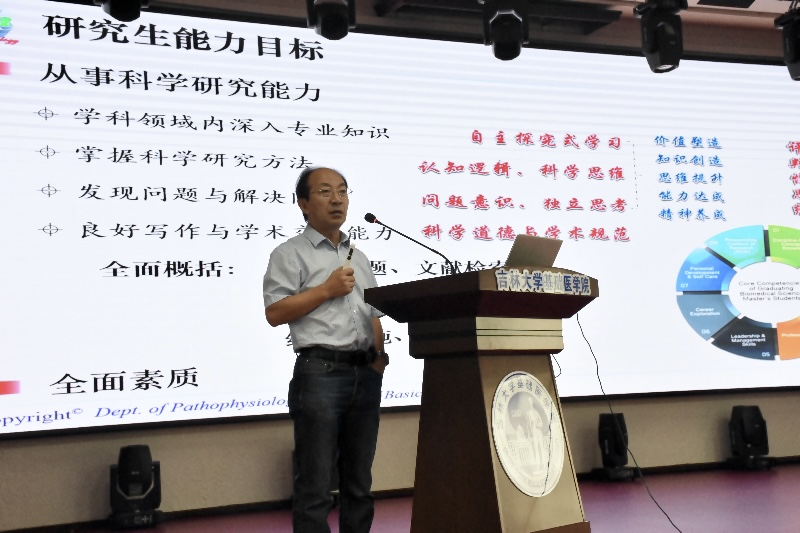 首先,李洪岩副院长以不负韶华,追求卓越”为主题,从研究生培养目标和培养标准以及影响研究培养的原因讲起,指出研究生科学研究的能力培养关键是科学思维,研究生需在具备学科领域内专深的专业知识基础上,掌握科学研究方法和独立思考能力,重点是研究生要具备提出问题和解决问题的能力。同时强调,从入学开始研究生要就要养成良好的学风,端正学术态度。
