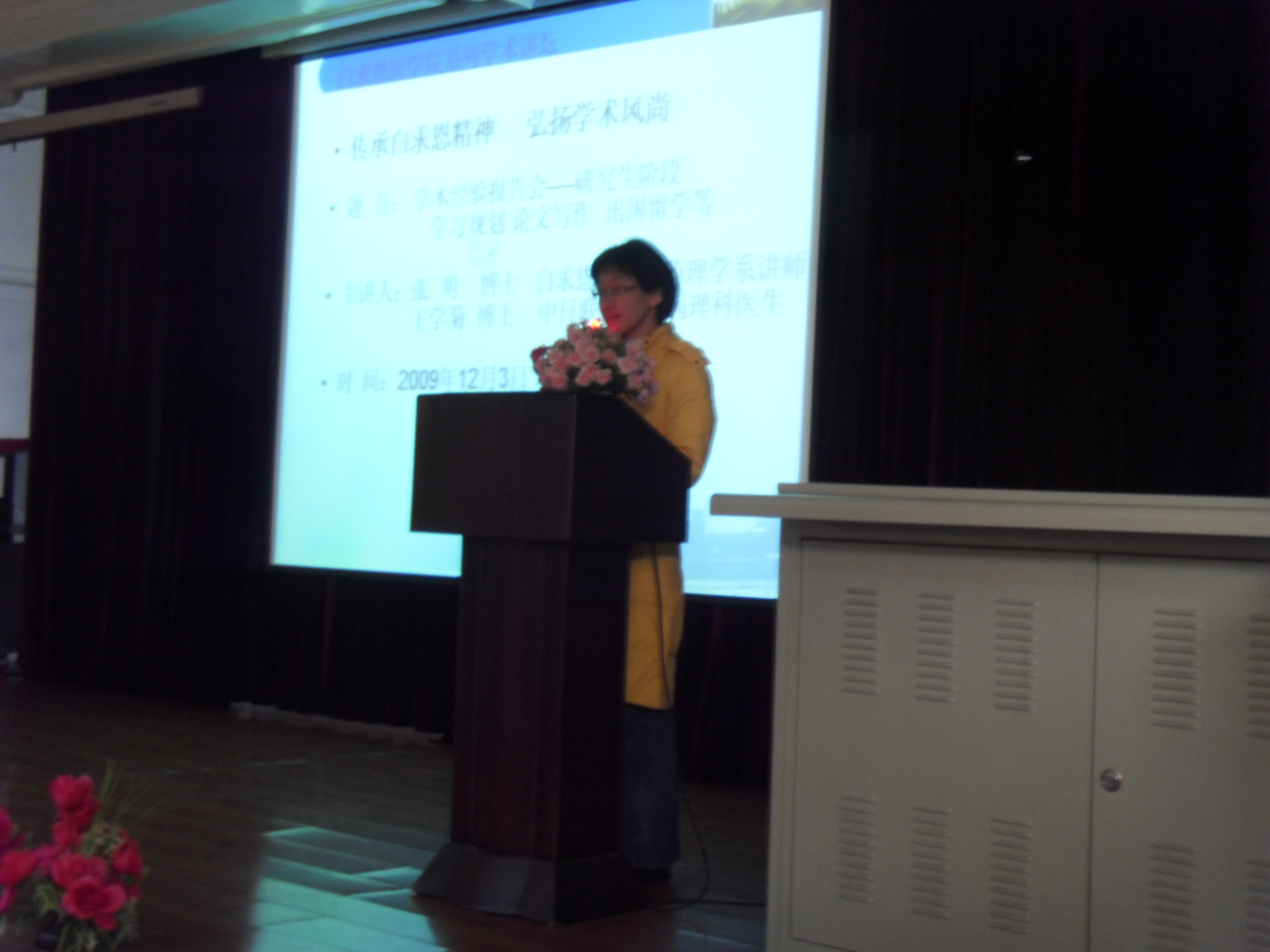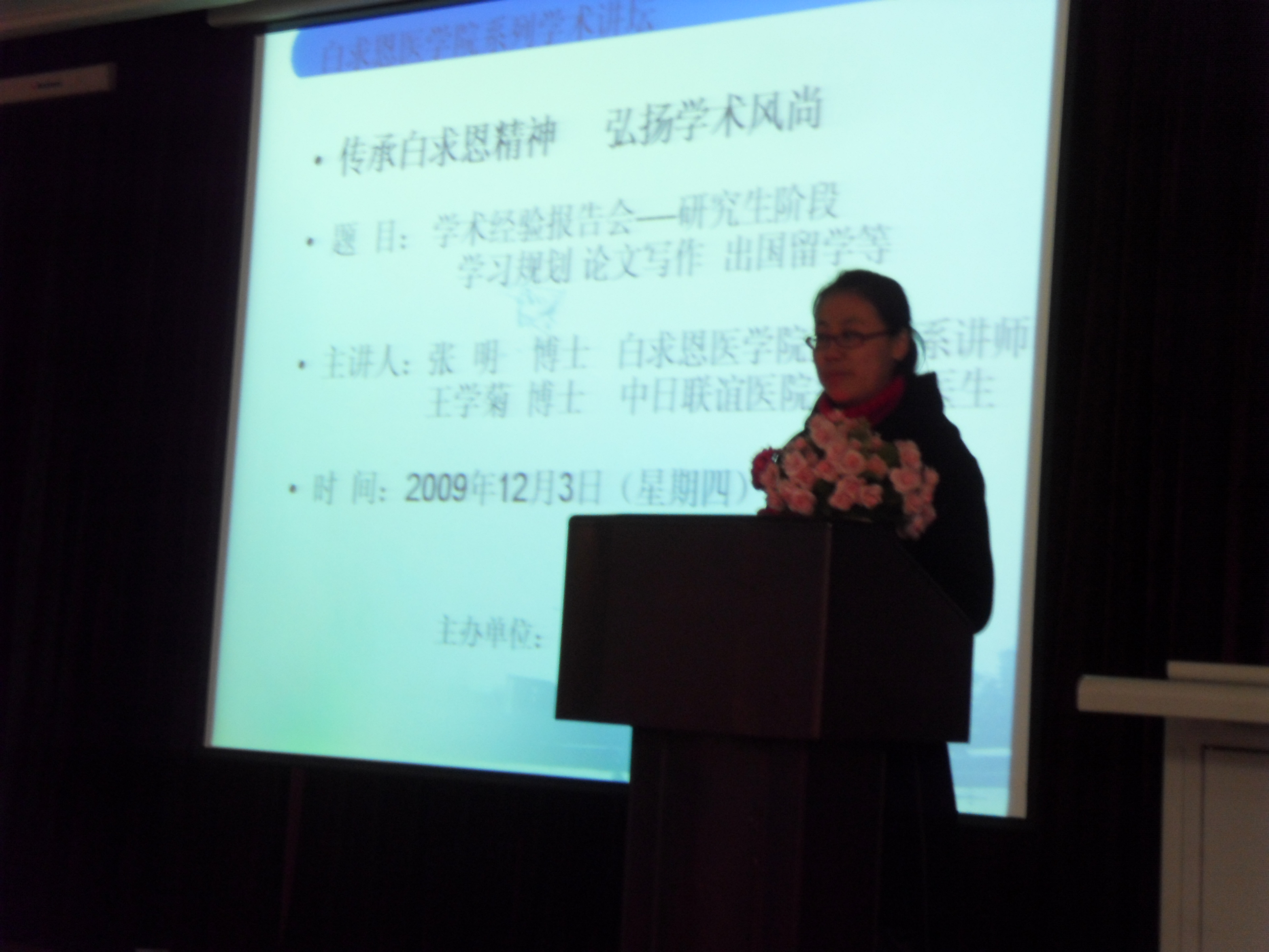 “传承白求恩精神 弘扬学术风尚” 系列学术活动在基础二楼多功能厅拉开序幕,本次活动邀请了两位优秀毕业生做了一场生动的学术经验报告会。学院党委副书记费淑波、研究生办公室主任陈野和2009级研究生一起参加了报告会。报告会由学院研究生会学术部长杨念主持。