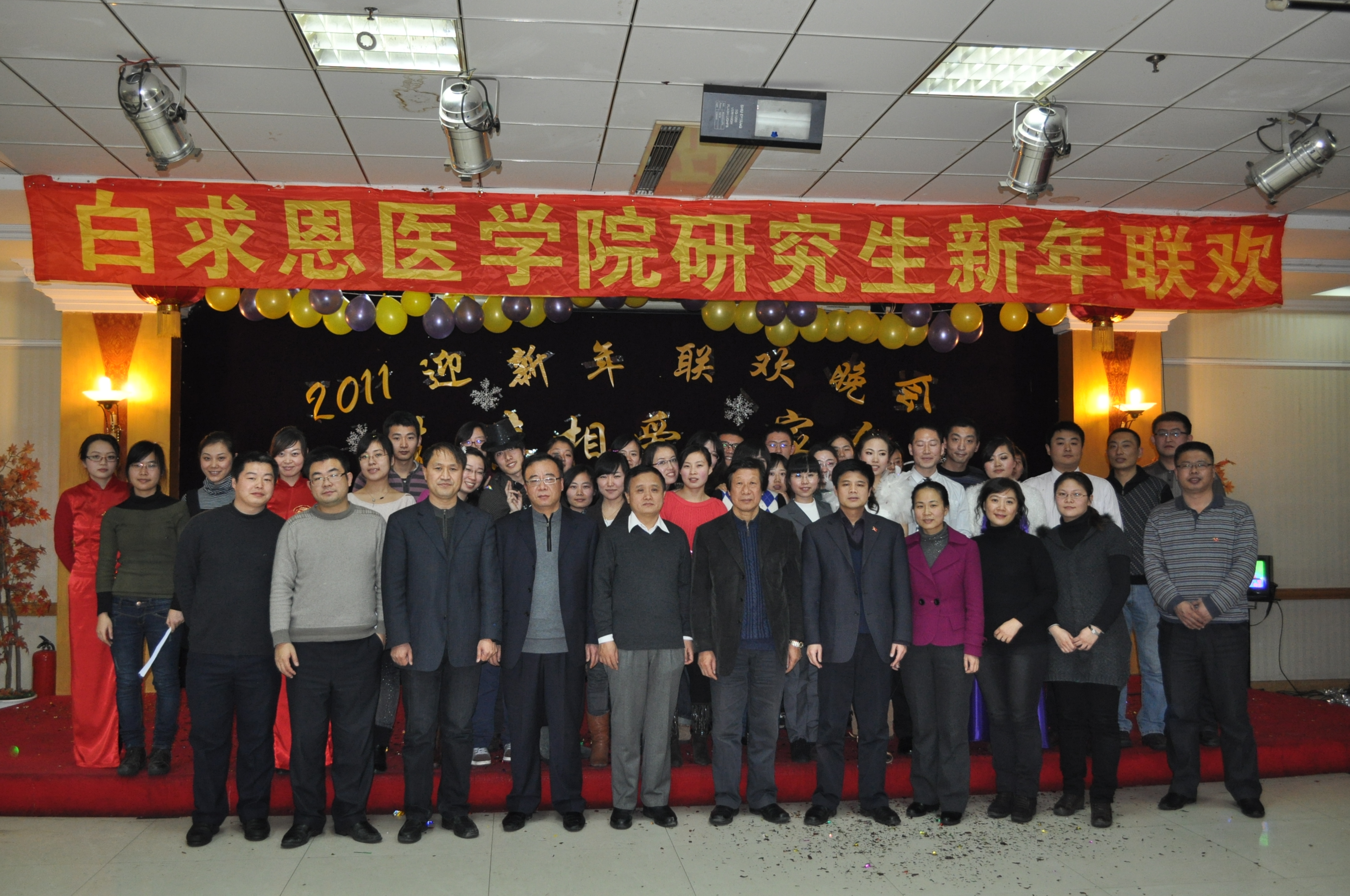 常务副校长、白求恩医学院院长李玉林教授,医学部学位委员会主席、学院常务副院长孙连坤教授,学院党委书记屈英和教授等学院领导班子成员和研究生办公室全体老师及学院的研究生一起参加了联欢晚会。2010级硕士研究生徐之会、钟丽颖、钟华、刘尊严主持了晚会。
