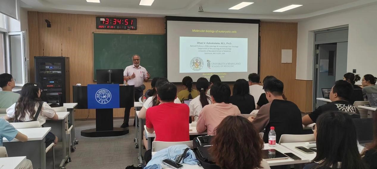 Dhan V. Kalvakolanu 教授的授课内容涵盖分子生物学前沿与高水平学术写作两大模块。他系统阐述了基因表达的时空调控机制、细胞信号传导通路、生长因子功能及其在肿瘤发生中的作用,以及程序性细胞死亡的分子机制。通过大量图示与案例,他将复杂的知识生动具象化,帮助学生深入理解核心概念。在学术写作环节,他结合自身丰富经验,全面讲解了论文撰写规范、图表呈现标准、审稿意见回应策略以及科研伦理与数据管理的国际规范,引导学生逐步建立起科学严谨的学术写作框架。同时,他还鼓励学生围绕“信号通路异常与疾病机制”“生长因子受体突变与肿瘤靶向治疗策略”等议题展开讨论,课堂氛围热烈,互动频繁。